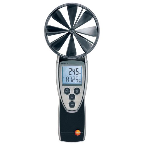 Flow direction is indicated by an arrow in the display. timed or multi-point averages are easily accomplished with all parameters and calculations. Min-Max values can also be displayed. The"Hold" function freezes current readings in the display making data recording easy. Can use real-time or average CFM, velocity, temperature. True velocity measurement - no air density correction required. The Testo 417 as a simple one hand operation style and is easy to carry and operate.