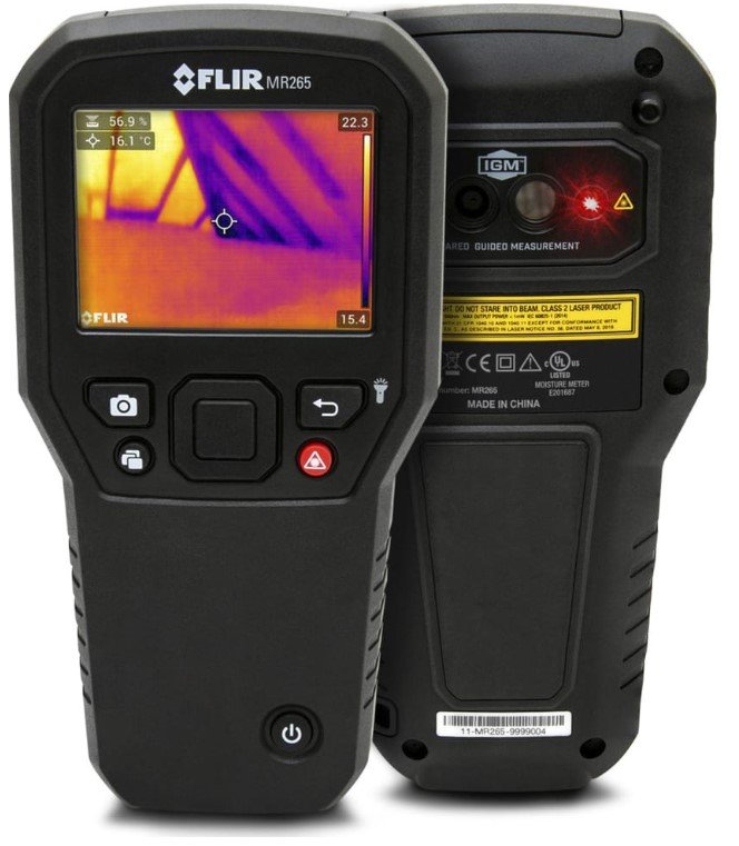 The FLIR MR265 is a combination pin and pinless moisture meter with thermal imaging designed to show building and facilities maintenance professionals exactly where to investigate issues related to moisture, air leaks, and insulation voids. Featuring FLIR IGM (Infrared Guided Measurement) technology, the MR265 helps users quickly scan and target problem areas, visually guiding them to the spot where they can confidently take measurements, analyze readings, and ensure that problems are fixed. FLIR MSX (Multi-Spectral Dynamic Imaging enhancement) technology makes it easy to recognize where issues are located by embossing visual details from the built-in visual camera onto thermal images. Using FLIR Thermal Studio, inspectors can then create and share professional reports that include findings and proof of repairs - giving customers peace of mind that mold, rot, or moisture challenges have been resolved.