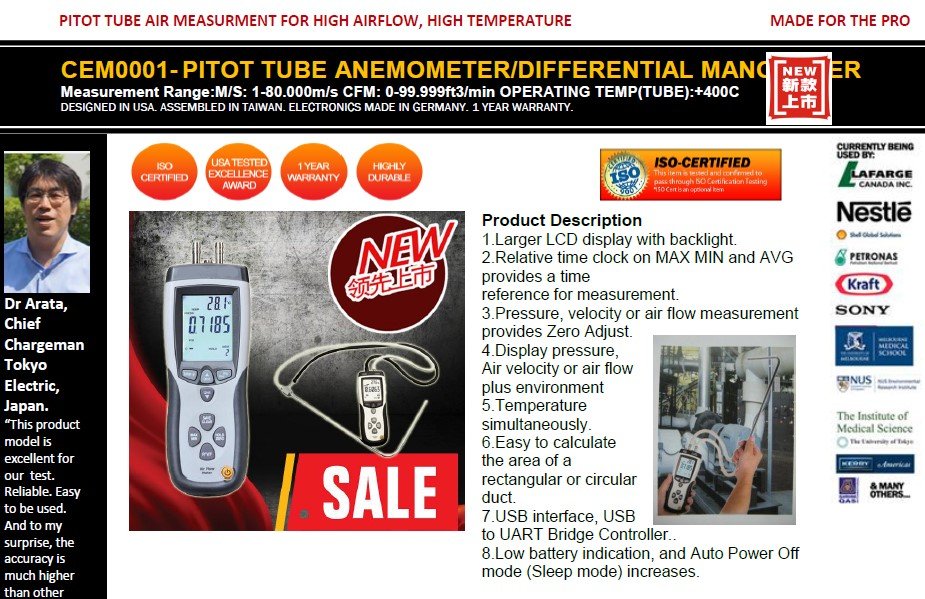 CEM0001 KKINSTRUMENTS PITOT TUBE ANEMOMETER/DIFFERENTIAL MANOMETER SET - AIRFLOW (SAME AS HD350)