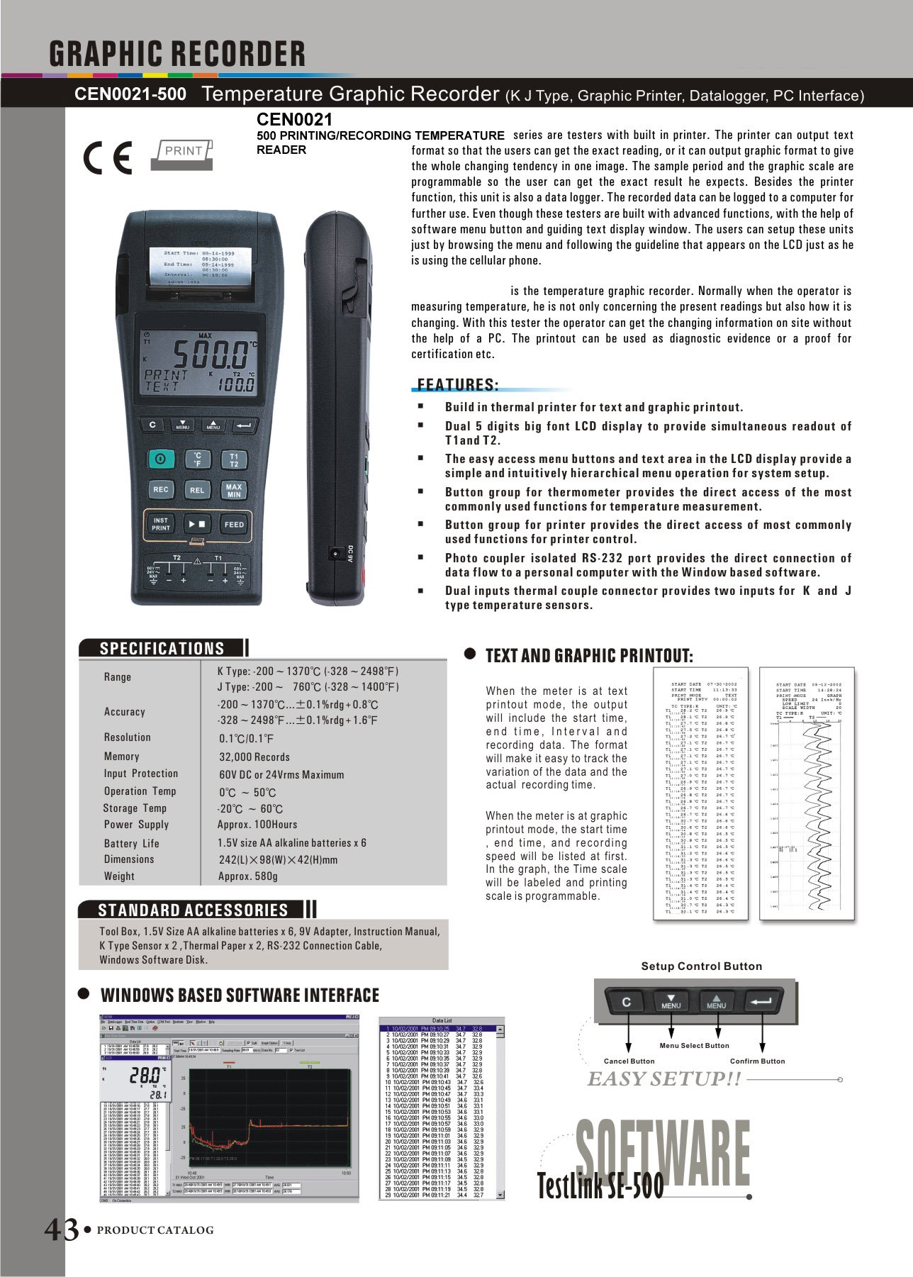 CEN0021-500V2 PRINTING TEMPERATURE GRAPHIC RECORDER (K,J/GRAPHIC PRINTER/ DATALOGGER / USB)