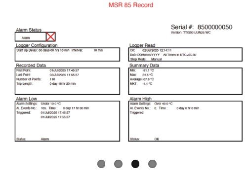 After transport, recipients can immediately see via the LED whether threshold values have been exceeded. Once recording is stopped by pressing the button, and the logger is connected to a PC via USB, the MSR85 automatically generates tamper-proof PDF and CSV reports with all relevant data.