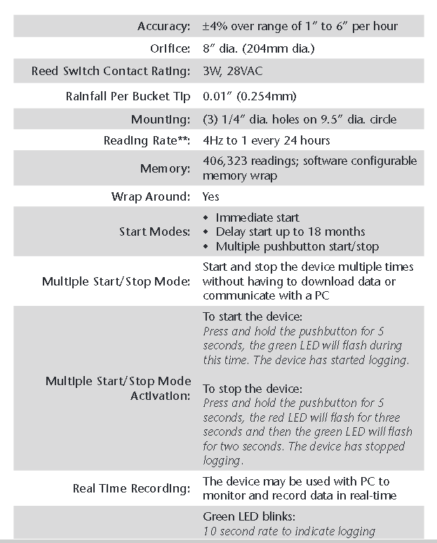 The Rain101A features a 10 year battery life, 4 Hz reading rate, a multiple start/stop function, ultra-high speed download capability, 406,323 reading storage capacity, optional memory wrap, battery life indicator, optional password protection and more.