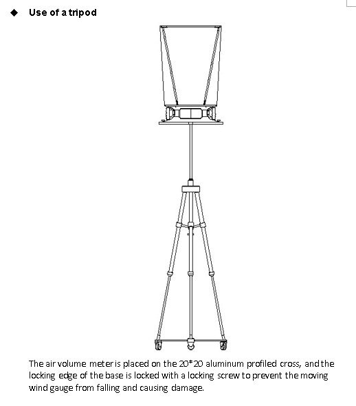 The air volume meter is placed on the 20*20 aluminum profiled cross, and the locking edge of the base is locked with a locking screw to prevent the moving wind gauge from falling and causing damage.