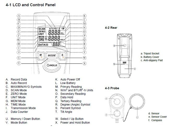 0.00~99.99 W/m2: 0.001 W/m2; 100.0~999.9W/m2: 0.01 W/m2; 1000~2000W/m2: 1 W/m2