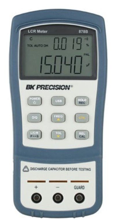The model 878B 40,000-count handheld LCR meter measures inductance, capacitance, and resistance quickly and precisely. Fast auto-ranging and quick measurement configuration such as measurement parameters and test frequency selection make the 878B very simple to operate. The meter also includes handy functions such as data hold, Min/Max/Average recording, tolerance sorting, and relative mode. Measurement data can continuously transfer to a PC via the meter's mini USB interface, using either the provided data logging software or SCPI commands sent from a custom program.
