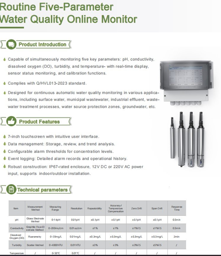 • Capable of simultaneously monitoring five key parameters: pH, conductivity, dissolved oxygen (DO), turbidity, and temperature- with real-time display, sensor status monitoring, and calibration functions.