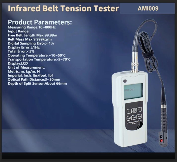 The Infrared Belt Tension Meter can measure the belt tension of motor and other machines quickly. This tensiometer can measure the natural vibration frequency of the belt through the emission and reception of the laser, and then calculate the tension value of the belt by combining the input belt mass and the free belt length.